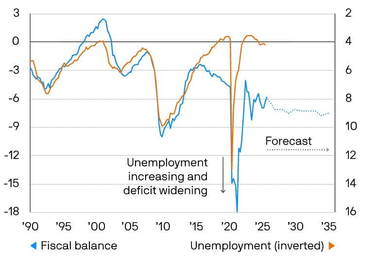 Source: Bloomberg, CBO, J.P. Morgan Asset Management. The fiscal balance forecast is based on the CBO’s latest budget and economic outlook. Data as of 31 October 2025.